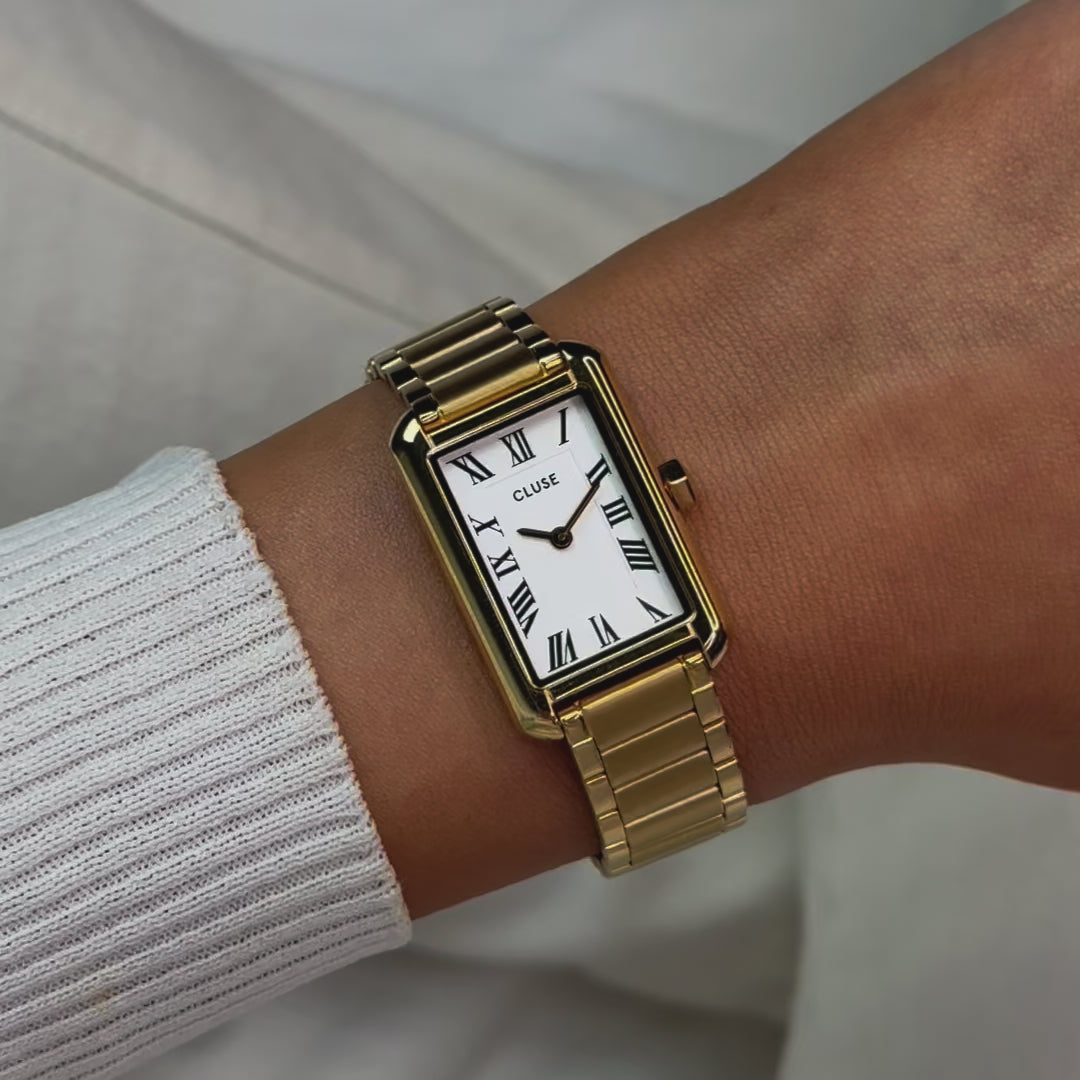 El Reloj Cluse Belisenna Dorado y Blanco es una pieza que transmite elegancia atemporal. Su diseño refinado presenta una caja rectangular de 21 mm en acero inoxidable dorado, una esfera blanca de inspiración vintage y una correa dorada de 14 mm con 3 eslabones, creando un equilibrio perfecto entre sofisticación y encanto clásico.